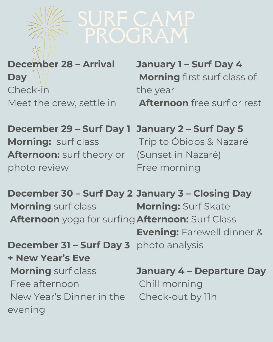 • 5 dni lekcji surfingu (8 lekcji) z naszymi wykwalifikowanymi instruktorami (lekcje w języku angielskim)
